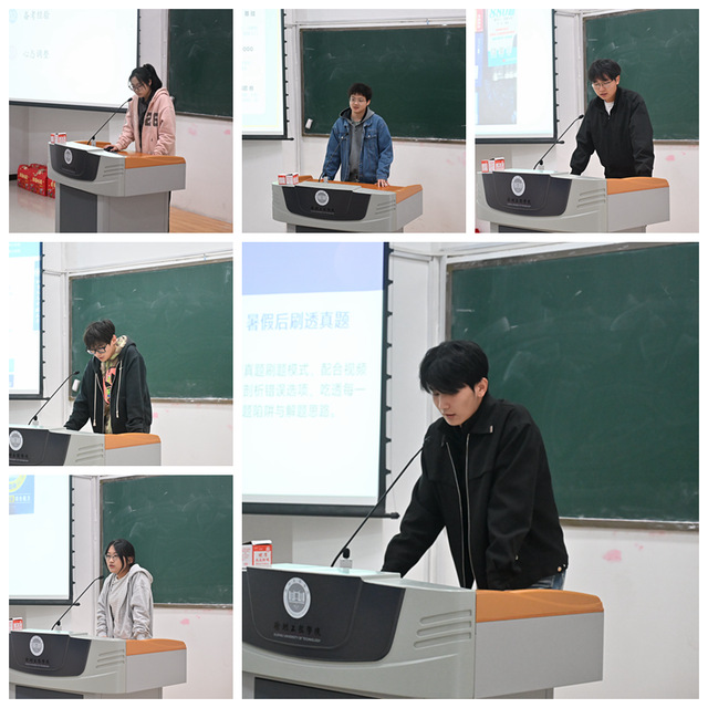 随后,来自22大数据管理、22房管、22物流1班、22信管1班的王心怡、夏继凡、褚云峰、邵振涛、尹亚文、田德旺六位同学依次登台,围绕择校策略、复习节奏、公共课与专业课备考方法、心态调整及复试技巧等维度,结合PPT进行了详实生动的分享。内容贴近实际、针对性强,赢得了现场同学的热烈反响。