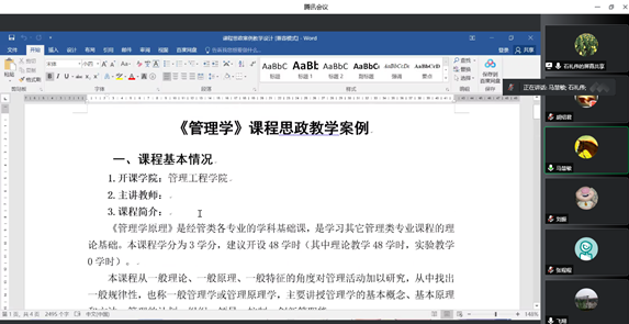 此次会议中,石礼伟教授以《管理学原理》课程为例,从思政目标、课程内容、教学实施过程等多个方面对课程思政教学案例撰写进行了详细指导。他强调,课程思政教学案例应有明确的教学目标,案例挖掘应围绕这个目标,突出价值引领,在教学理念、思路、内容、手段等方面创新,用润物细无声的方式将思政元素融入课程教学中。会上,部分课程教师对各自撰写的课程思政教学案例进行了汇报。