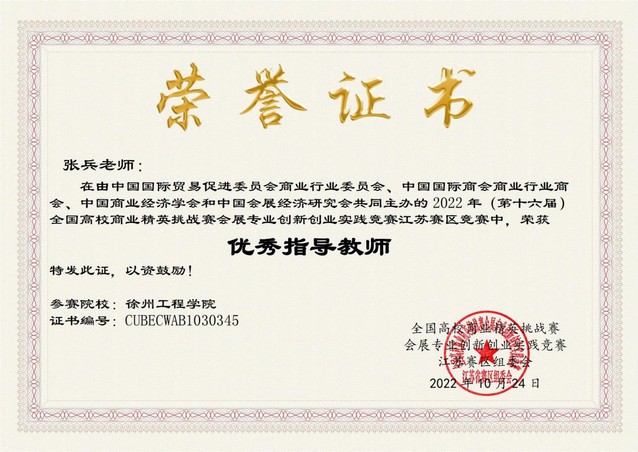 项一等奖,将代表江苏参加全国赛,张兵老师被评为优秀指导教师。希望这两支学生队伍再接再厉,在张兵老师带领下,在全国赛中取得好成绩。
