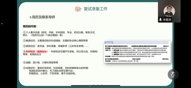 会议开始,主持人对本次会议的主题做了简单介绍。接着,徐嘉闻同学分享复试经验,他强调个人简历及联系导师至关重要,详细说明简历内容可分为个人基本信息、获奖经历、科研经历、教育经历等,其中科研经历最为重要。同时也要做好学校指定用书和考研用书的资料准备工作。随后,张震同学主要从复试科目、证明材料及复试流程进行了经验分享。对考研复试的一些专业问题和综合问题做了细致分享,强调要仔细研读复试学校的相关规定,带好证明材料。