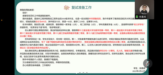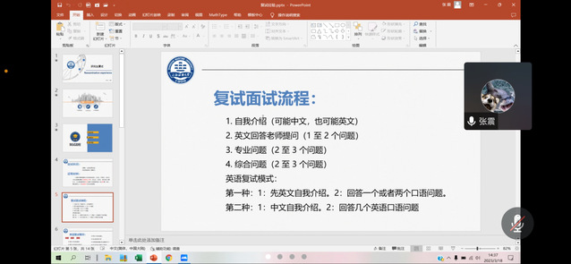 近日,为进一步帮助学院考研学子全面了解掌握复试流程与方法,william英国顺利召开2023届考研复试线上指导活动。会议由主席王薪然主持,2022届优秀毕业生徐嘉闻、张震同学分享各自的考研复试经验和心路历程。