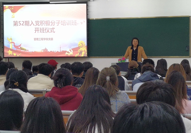开班仪式在庄严的国歌声中拉开序幕。首先姚书记为学员们作了开班动员,阐明了本次入党积极分子培训的意义,并提出三点要求。一是提高认识,深刻领会举办积极分子培训班的重要意义;二是主动作为,在学风建设中、实践活动中以优异的成绩接受党的考验;三是严格要求,确保圆满完成学习任务。接着她图文并茂地讲述了中国共产党奋斗的光辉历程和历史性贡献,教育引导入党积极分子们从波澜壮阔的百年奋斗史中汲取前行的勇气、精神、智慧和力量。最后,姚书记强调党课是每一位入党积极分子提升党性修养的必修课,希望同学们要珍惜这次培训机会,以认真的学习态度和良好的精神面貌全身心投入培训当中。