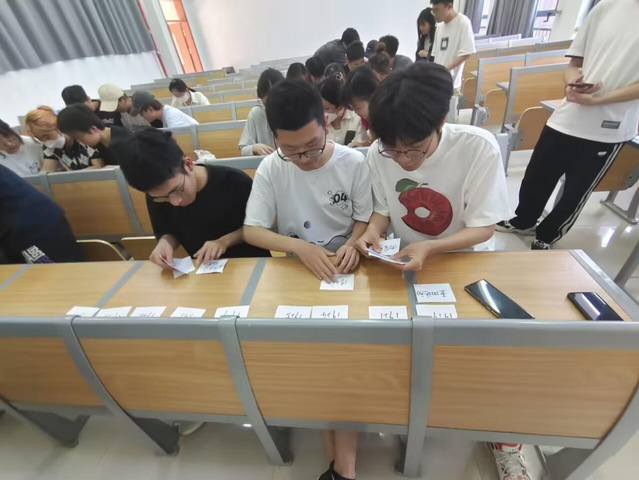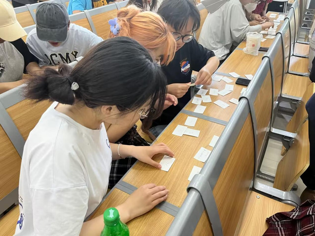 各组成员到达指定教室后按照小组顺序进行落座。主持人强调规则后,发放活动卡。之后,每组计时3分钟开始,小组成员将代表时间,事件和关键地点或人物的小卡片进行分类,并且一一对应。活动过程中,每个小组的同学互帮互助,讨论十分激烈,每个小组都将卡片进行自己理解的排序。时间结束后,同一行的两个小组的组长互换位置,根据大屏幕上的答案互相检查并得出每小组配对正确的组数。最后,在游戏结束后,举办方对游戏中所提及的历史事件进行简单的讲解,带领同学们重温历史事件,弘扬爱国精神。
