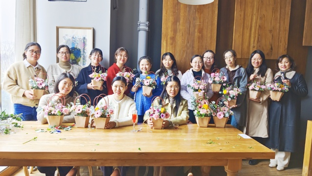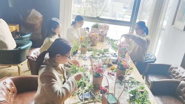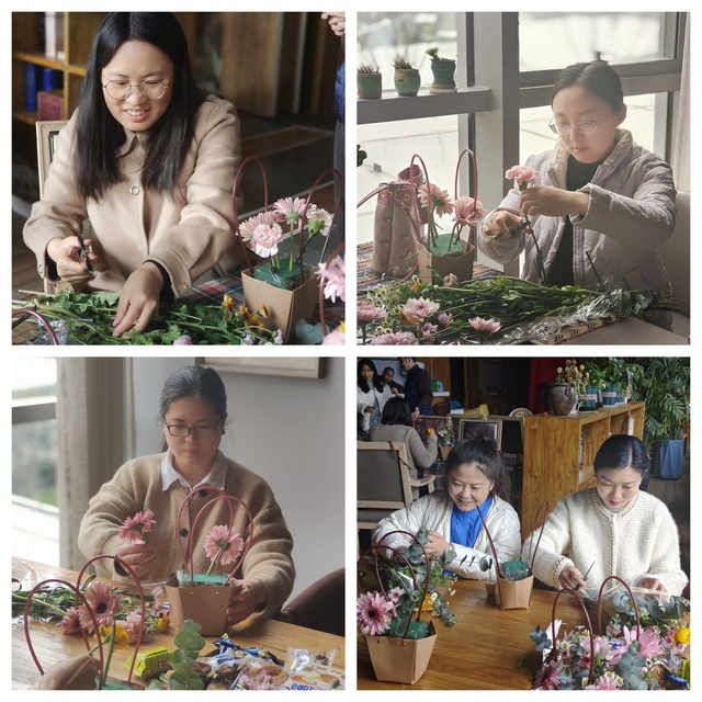 在老师的指导下,大家纷纷动手尝试,将一朵朵鲜花巧妙地搭配在一起,创作了独具匠心的花艺作品。每个人脸上都洋溢着幸福的微笑,互相交流插花心得,分享生活中的点滴快乐,现场充满了欢声笑语,气氛温馨而美好。