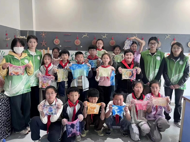活动现场,大学生志愿者首先为小朋友们讲解了扎染的历史和制作工艺及技巧。之后,志愿者们带领小朋友们动手实践,扎染工艺分为扎结和染色两部分,志愿者们教小朋友们用绳子和小木棍将白布折叠、扎牢、定形,然后帮助小朋友们在白布上涂上五颜六色的颜料,创造出属于自己的扎染作品。