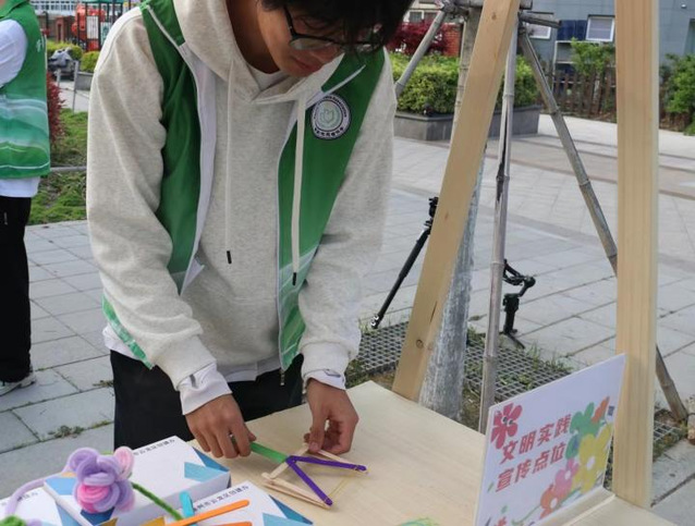 志愿者们利用雪糕棒和扭扭棒变废为宝,发挥想象力制作成美观的饰品来装饰活动现场。