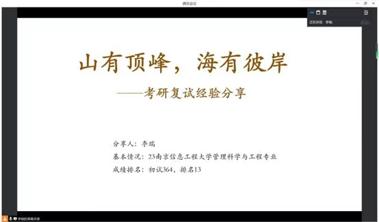 为帮助考研学子深入了解复试,丰富复试经验,增强备考信心,我院联合校关工委于3月8日下午六点举行线上复试经验分享会,邀请到2019级信息管理与信息系统专业,现南京信息工程大学管理科学与工程专业研究生的李瑞同学与大家进行经验交流。