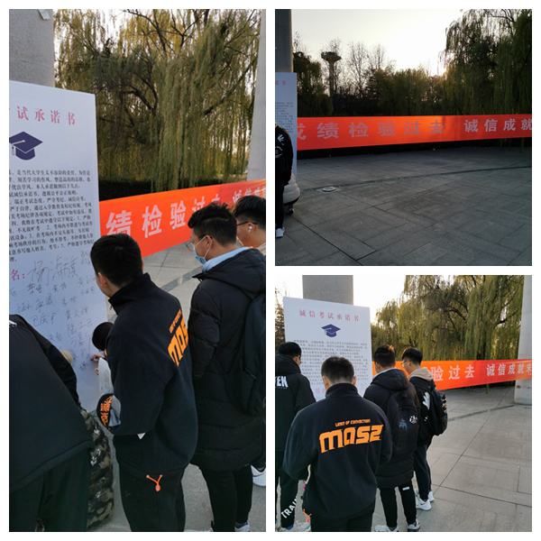 签署诚信考试承诺书,增强诚信意识。为进一步加强学生诚信意识,将诚信考试落到实处,确保将考试相关纪律要求传达给每一名同学,坚决抵制作弊行为,学院制作承诺书,组织全院同学共同签署,要求同学们谨记承诺内容,克服侥幸心理,自觉抵制作弊行为,力求达到教育广大学生诚信考试的目的,激发学生学习动力。