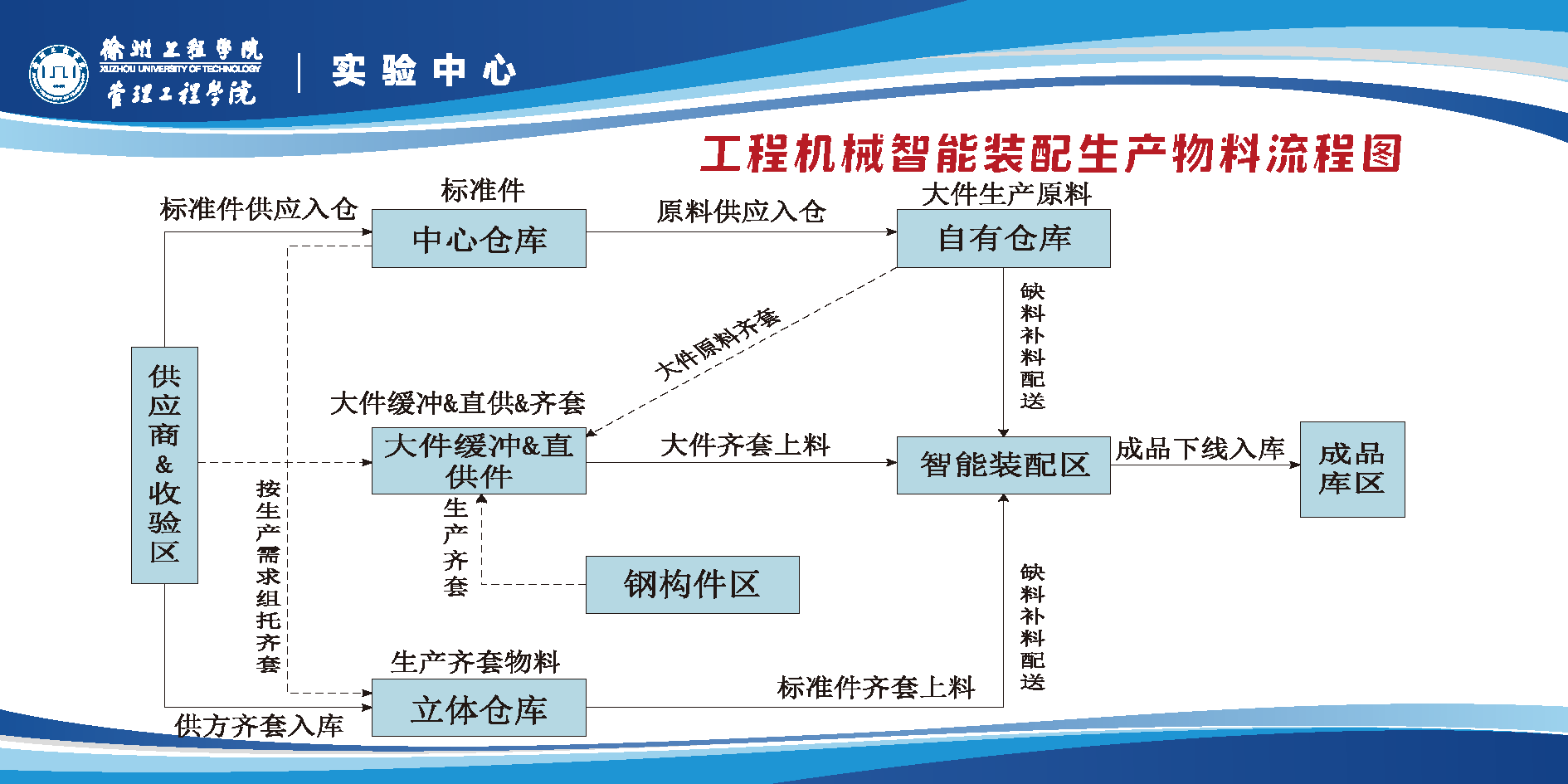 该实验室模拟徐工集团重型机械关键部件装配机器人系统、3D视觉辅助检测系统、自动化立体仓库系统、AGV产线物料搬运系统、线边库存系统、线边叫料ANDON系统、装配线物料齐套配送分拣系统、智能制造产线数据采集系统、产线MES执行系统、产线与物流大数据分析系统、产线及其物流大数据同屏看板显示系统等线边物流系统。把徐工集团重型机械相关生产线的线边物流“搬”到实验室,具有高度的仿真性,能够直观地展示生产线各个环节的物流信息,帮助学生更好地理解和掌握智能制造相关物流技术。