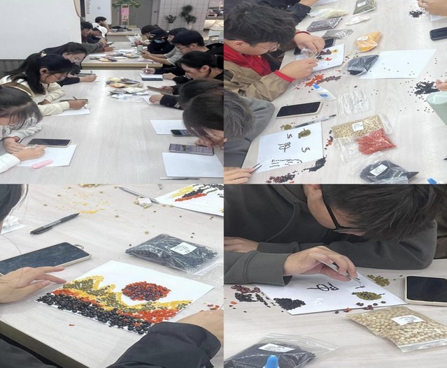 在活动前期由相关人员准备好需要用到的材料和工具,例如、镊子、胶水、卡纸等。五谷杂粮画是中华古老的一门传统民间手艺,同学们想要制作一幅精彩绝伦的画卷不是特别容易,同学们需要以五谷杂粮为主体,通过粘、贴、拼、雕等手段,利用其它辅料粘贴而成:人物、山水、花鸟、抽象等画面,运用构图、线条、明暗、色彩等造型手法,对画面进行特殊处理,力求创作出色彩自然,层次分明,立体感强的作品。同学们都倾情投入其中,以高效率、高质量的水准完成了此次活动的参与。此次活动同学用饱满的热情倾诉了对重阳节的理解,对五谷丰登、国泰明安伟大祖国的祝福。