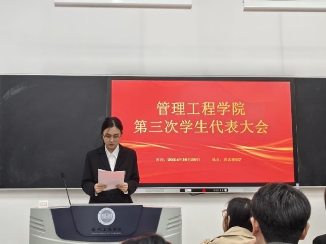 会议在庄严的国歌声中拉开帷幕。学生会主席温影凡进行了工作报告,报告回顾了过去一年学生会在学术活动、校园文化、权益维护等方面的工作成果,总结了经验教训,并提出了未来一年的工作计划。最后由团委副书记薛成成老师进行总结讲话,预祝学生代表大会圆满成功。她还鼓励大家要保持初心,勇于担当,不断创新,为学院的发展贡献自己的智慧和力量。