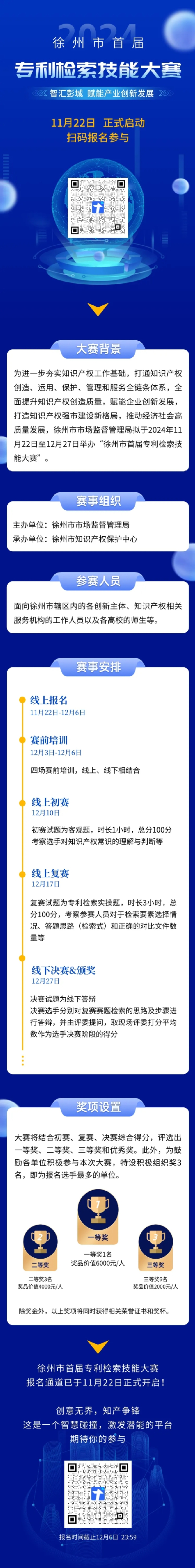 为进一步夯实知识产权工作基础,打通知识产权创造、运用、保护、管理和服务全链条体系,全面提升知识产权创造质量,赋能企业创新发展,打造知识产权强市建设新格局,推动经济社会高质量发展,徐州市市场监督管理局拟于2024年11月22日至12月27日举办“徐州市首届专利检索能大赛”。